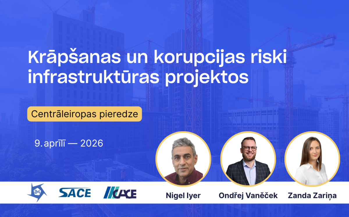 Vebinārs ar nosaukumu “Krāpšanas un korupcijas riski infrastruktūras projektos: Centrāleiropas pieredze” notiks tiešsaistē 2026. gada 9. aprīlī plkst. 11.00 un tajā tiks analizēta pieredze un mācības par šiem riskiem infrastruktūras projektos Baltijas valstīs, Slovākijā un Čehijā.